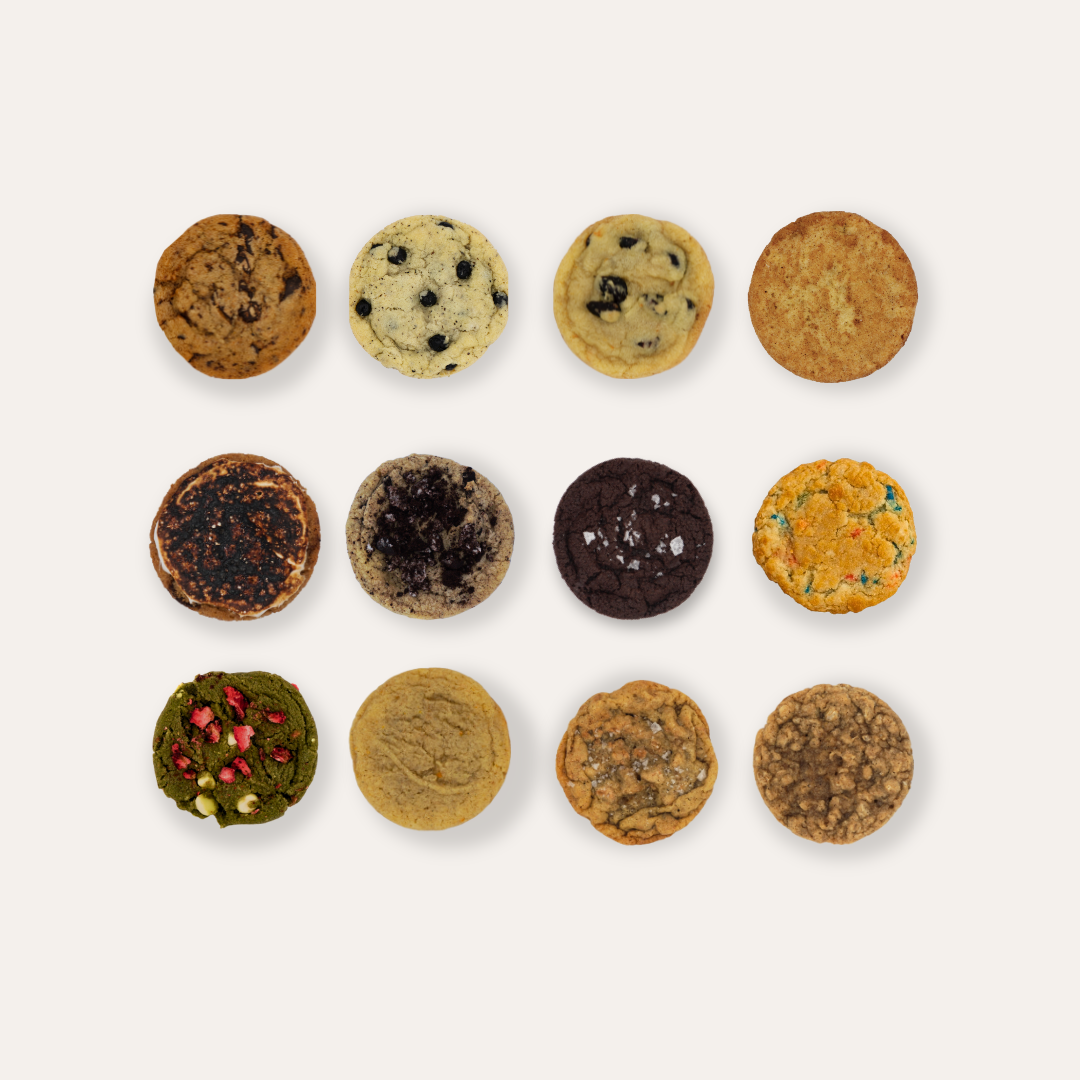 This month's variety pack features: Brown Butter Dark Choco, Earl Gray Blueberry Lavender, Orange Cranberry, Snickerdoodle, S'mores, Cookies n Cream, Choco Chunk Sea Salt, Birthday Cake, Matcha Strawberry White Choco, Orange Cardamom, Sea Salt Caramel, and Oatmeal!